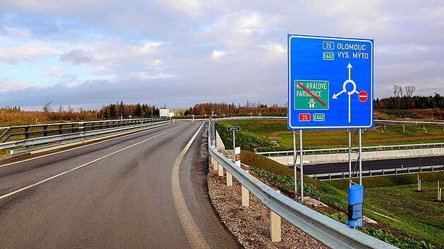 Nové dopravní značení u mimoúrovňové křižovatky Džbánov, kde zatím dálnice D35 končí. (11. prosince 2025)