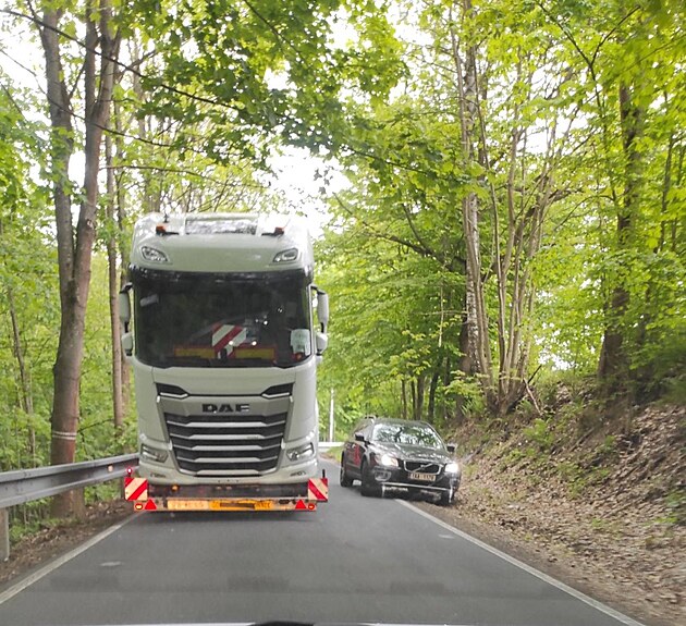 Průjezd úzkými zatáčkami u Vranové Lhoty je pro kamiony opravdu těsný a protijedoucí osobní auta se tak musí vyhýbat mimo vozovku. (7. května 2025)