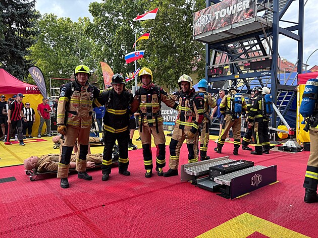 Hasiči v plné výstroji pod věží při jedné z nejtěžších soutěží. (15. září 2025)