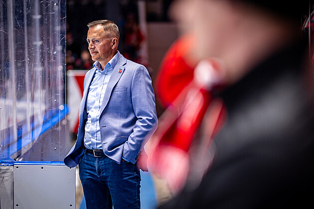 Petr Dědek sleduje rozbruslení před extraligovým zápasem Pardubic. (16. února 2025)