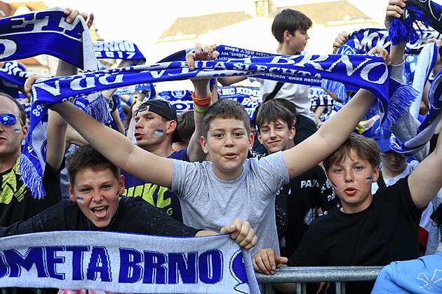 Brněnští fanoušci se při posledním zápase finále extraligy sešli na Zelném trhu. (29. dubna 2025)