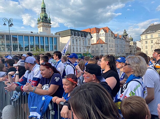 Stovky fanoušků se už půl hodiny před rozhodujícím zápasem finále hokejové extraligy scházejí na Zelném trhu v Brně. (29. dubna 2025)