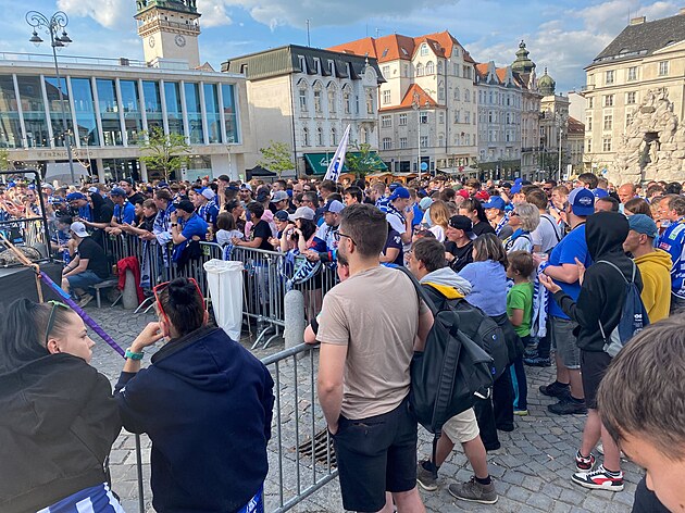 Stovky fanoušků se už půl hodiny před rozhodujícím zápasem finále hokejové extraligy scházejí na Zelném trhu v Brně. (29. dubna 2025)