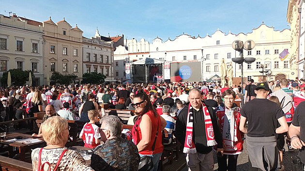 Fanoušci hokejových Pardubic se schází na Pernštejnském náměstí. (29. dubna 2025)