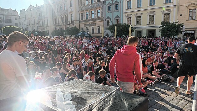 Fanoušci hokejových Pardubic se schází na Pernštejnském náměstí. (29. dubna 2025)