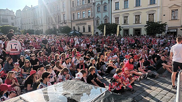 Fanoušci hokejových Pardubic se schází na Pernštejnském náměstí. (29. dubna 2025)