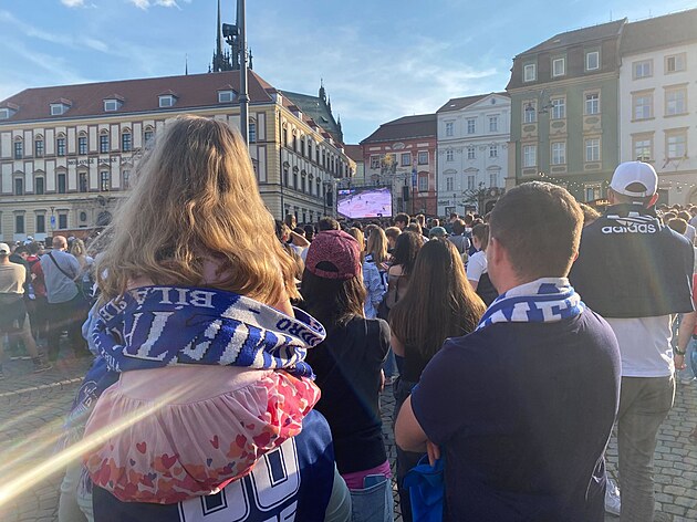 Brněnští fanoušci podporují své mužstvo při promítání finále extraligy na Zelném trhu. (29. dubna 2025)