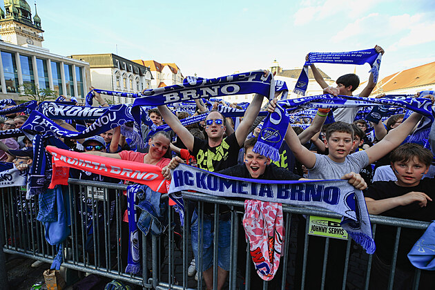 Brněnští fanoušci se při posledním zápase finále extraligy sešli na Zelném trhu. (29. dubna 2025)