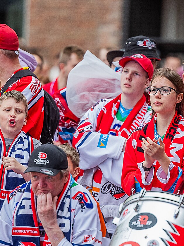 Do areálu Automatických mlýnů přišlo podpořit pardubické hokejisty v prvním finále extraligy proti brněnské Kometě několik stovek fanoušků. (17. dubna 2025)