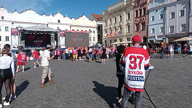 Pernštýnské náměstí v Pardubicích se pomalu začíná plnit fanoušky na sedmé finále hokejové extraligy s Brnem. (29.dubna 2025)