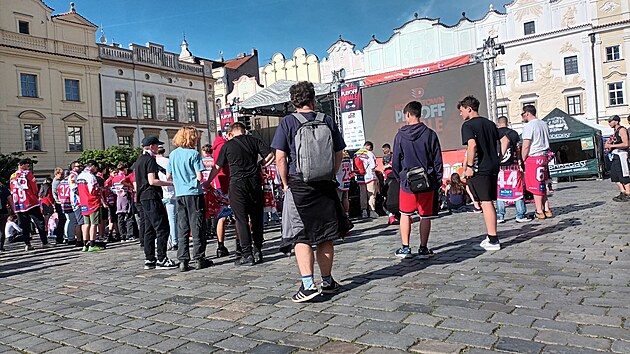 Pernštýnské náměstí v Pardubicích se pomalu začíná plnit fanoušky na sedmé finále hokejové extraligy s Brnem. (29.dubna 2025)