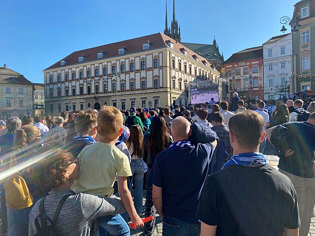 Fanoušci brněnské Komety při šestém zápasu finálové série na Zelném trhu v Brně. (27. dubna 2025)