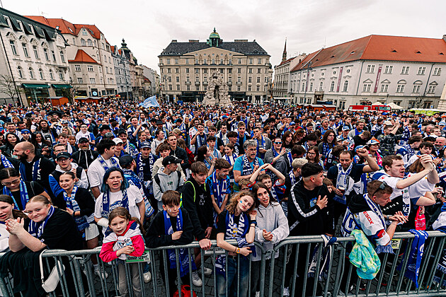 V Brně na Zelném trhu fandí hokejové Kometě ve finále proti Pardubicím tisícovky příznivců. (17. dubna 2025)