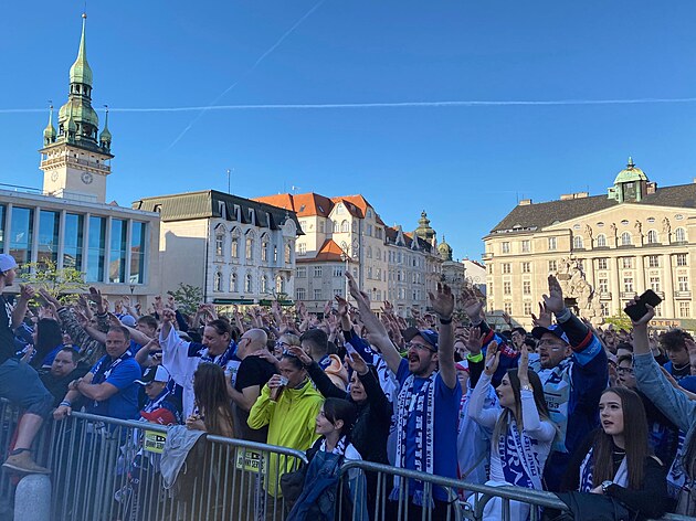 Fanoušci brněnské Komety se sešli při šestém zápasu finálové série na Zelném trhu v Brně. (27. dubna 2025)