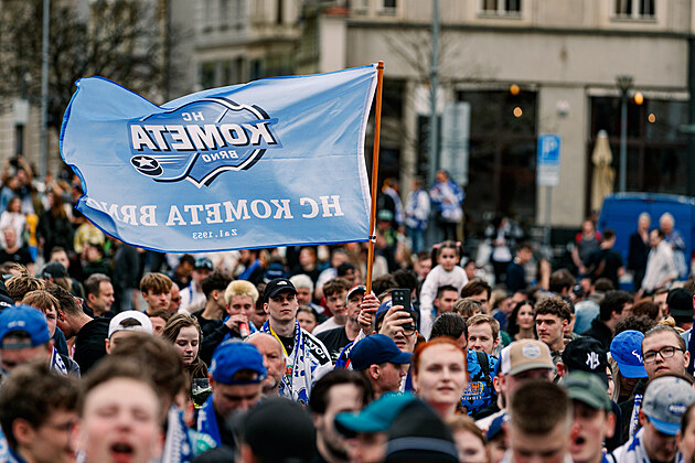 V Brně na Zelném trhu fandí hokejové Kometě ve finále proti Pardubicím tisícovky příznivců. (17. dubna 2025)