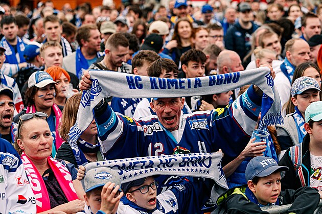 V Brně na Zelném trhu fandí hokejové Kometě ve finále proti Pardubicím tisícovky příznivců. (17. dubna 2025)