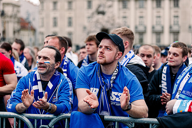 V Brně na Zelném trhu fandí hokejové Kometě ve finále proti Pardubicím tisícovky příznivců. (17. dubna 2025)