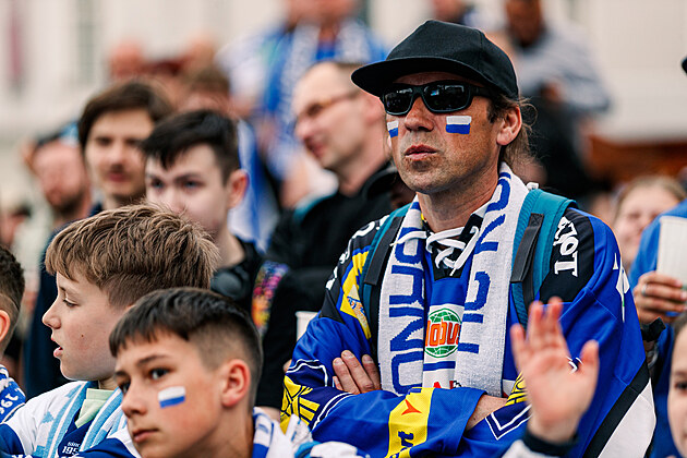 V Brně na Zelném trhu fandí hokejové Kometě ve finále proti Pardubicím tisícovky příznivců. (17. dubna 2025)