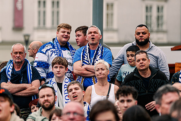 V Brně na Zelném trhu fandí hokejové Kometě ve finále proti Pardubicím tisícovky příznivců. (17. dubna 2025)