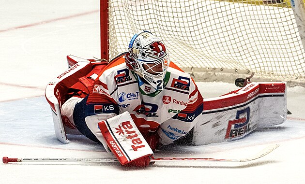 Američan Peter Mueller z Komety překonává pardubického gólmana Romana Willa v sedmém finále hokejové extraligy.