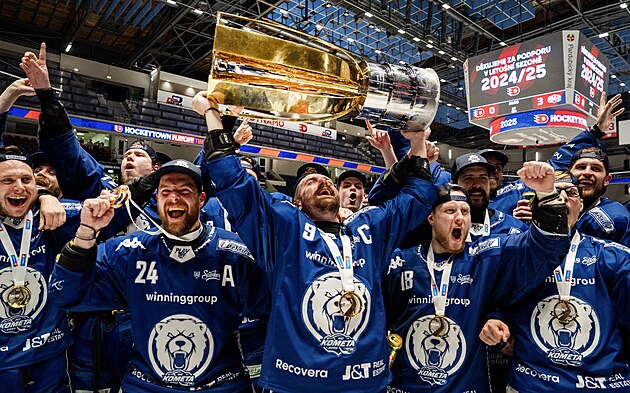 Kapitán Komety Jakub Flek (s pohárem) se se spoluhráči raduje ze zisku extraligového titulu.