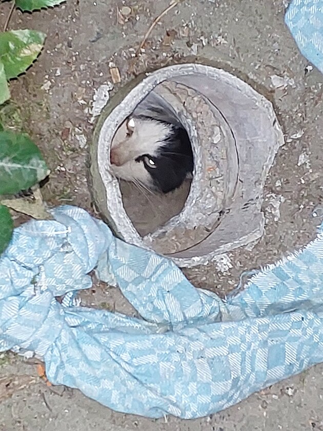 Hasiči vysvobozovali kočku ze starého odpadního potrubí v obci Sobkovice. (20. února 2025)