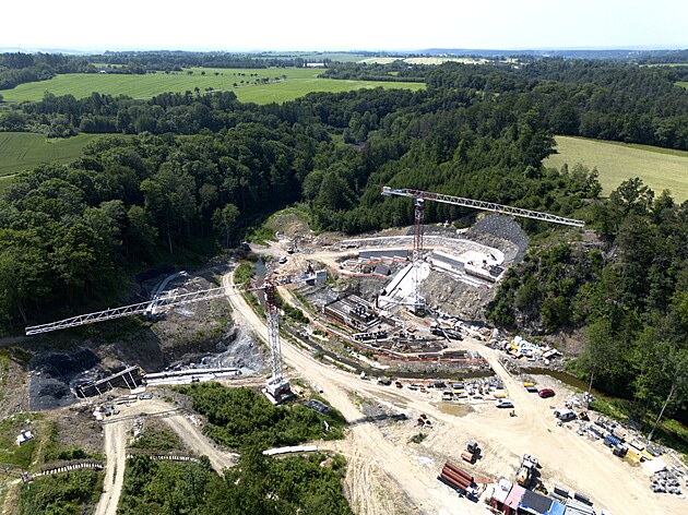 U Kutřína v zařízlém údolí říčky Krounky probíhá stavba hráze suchého poldru. (24. července 2025)