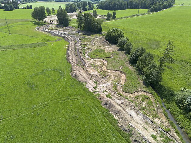 Martinický potok, který pod Kutřínem vtéká do Krounky, dostane zcela nové meandrující koryto s tůněmi. (24. července 2025)
