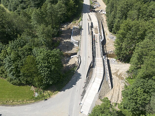 Stavaři kvůli přemostění Krounky nad poldrem museli na silnici II/359 zbudovat mostní provizórium. (24. července 2025)
