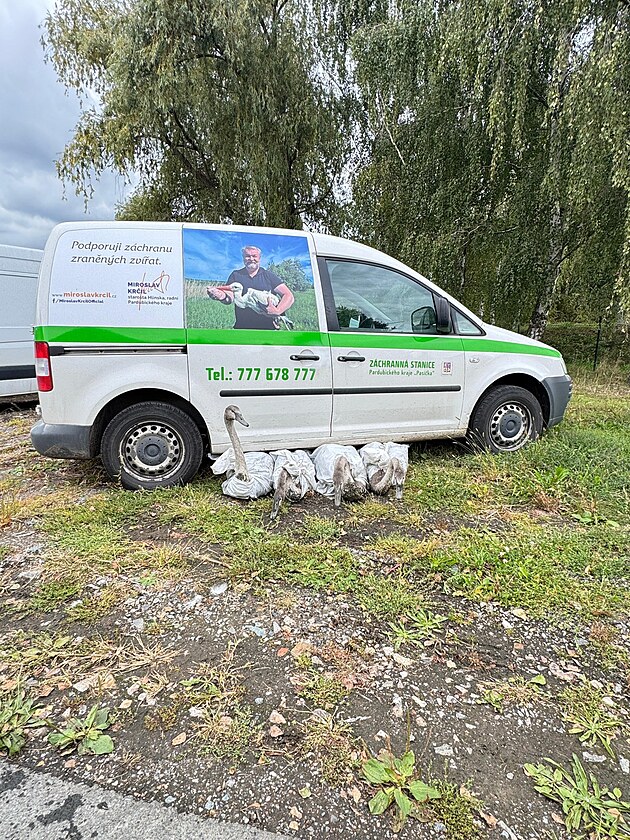 Labutí mláďata uvázla v bahně. S jejich záchranou pomohli hasiči z Přelouče. (30.září 2025)