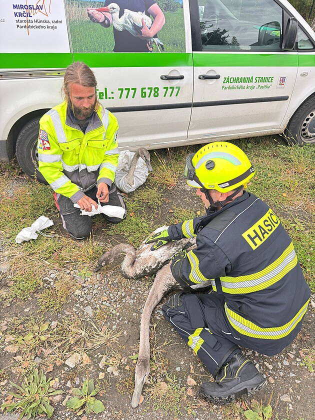 Labutí mláďata uvázla v bahně. S jejich záchranou pomohli hasiči z Přelouče. (30.září 2025)