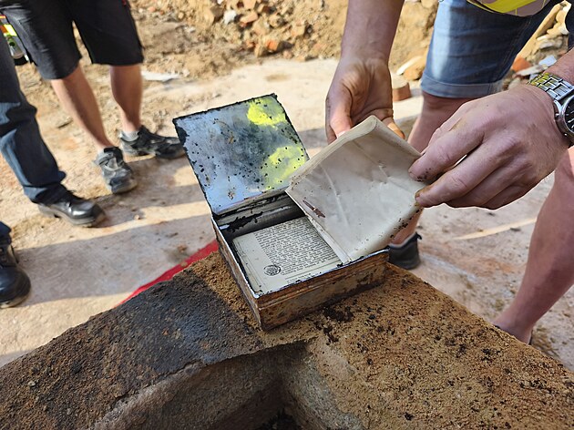 Ve čtvercové krabičce se nacházelo vydání pražských novin Prager Tagblatt ze dne 12. 5. 1886 s několikastránkovým pamětním spisem souvisejícím se stavbou „tabačky“. (25. srpna 2025)