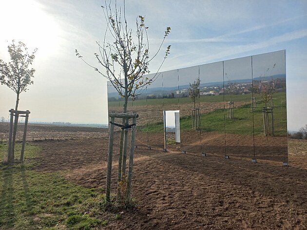 Instalace nizozemského architekta Winy Maase si v parku Zdeňka Kopala pohrává s odrazy oblohy, krajiny a nedalekého města v zrcadlové stěně. (6. listopadu 2024)