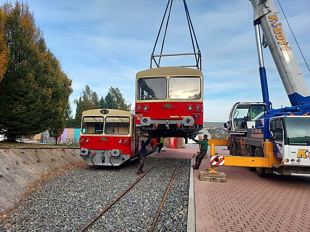 Autojeřáb usadil motorový vůz 810 a přípojný vůz 010 na předem položená kolejová pole.