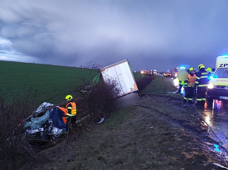 Osobní auto bylo po střetu zcela zdemolováno.