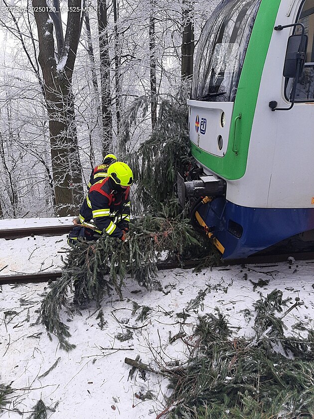 Vlak u Vendolí na Svitavsku najel do spadlého stromu. (20. ledna 2025)