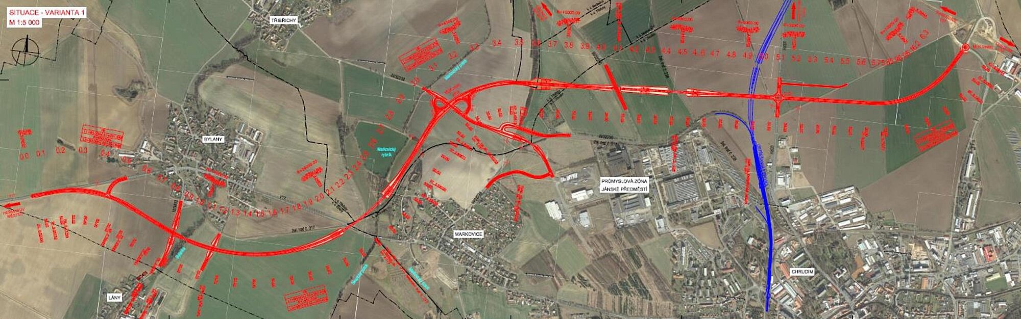 První varianta obchází jižně obec Bylany a severně Chrudim. Nevýhodou je 350 metrů dlouhá estakáda v místě křížení s tratí a současnou I/17.