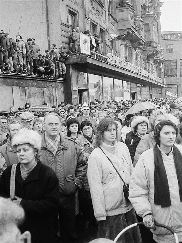 Atmosféra sametové revoluce vtáhla do dění tisícovky lidí. Snímek z náměstí Republiky.