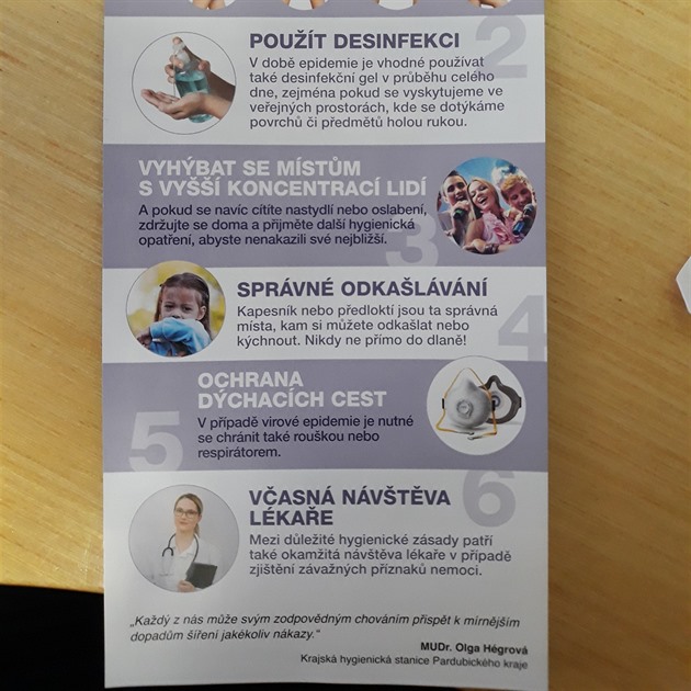 Kromě standardních hygienických zásad, že si mají lidé dobře mýt ruce nebo se vyhýbat místům s vyšší koncentrací lidí, se také na konci letáku píše: