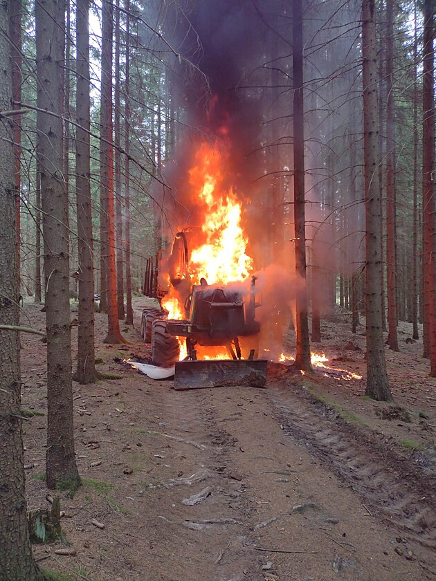 V lese na Svitavsku hořel dřevařský vůz, uniklo 100 litrů hydraulického oleje (7.dubna 2025)