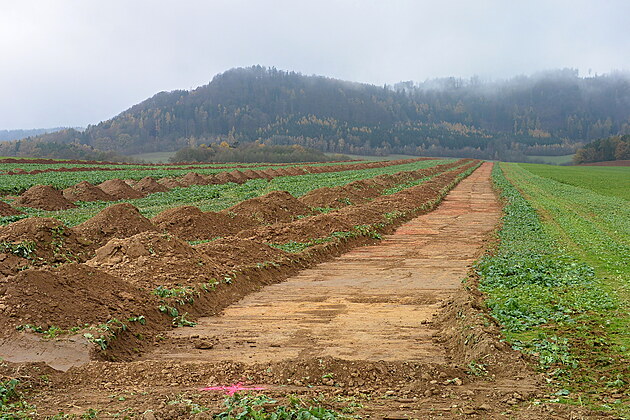 Archeologové pod Hřebečovským hřbetem po detektorovém průzkumu začali v šířce budoucí dálnice D35 provádět sondáž. (14. listopadu 2024)