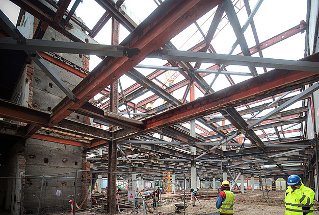 V budově samotného Prioru pak pokračuje otryskání a lakování ocelové konstrukce. Zároveň se dále budují nové ocelové stropní konstrukce. Provoz Paláce Pardubice není kvůli propojování s Priorem nijak omezen.
