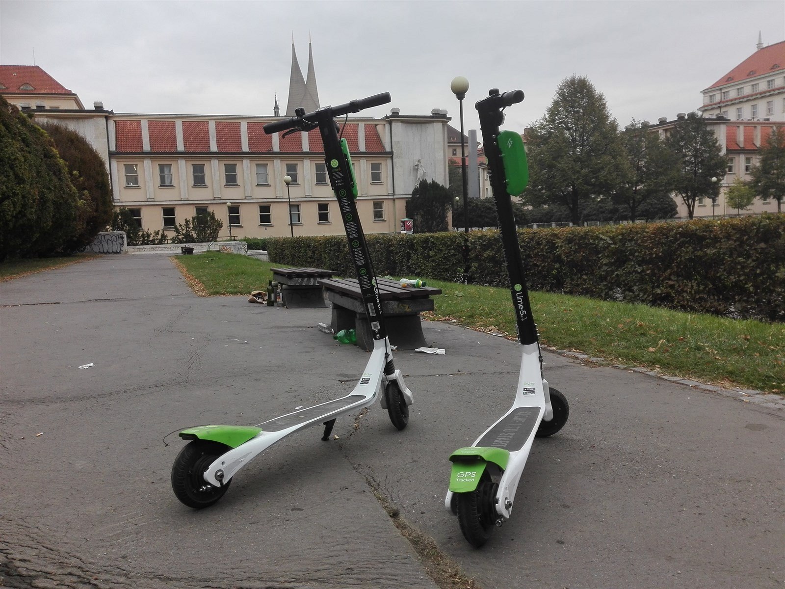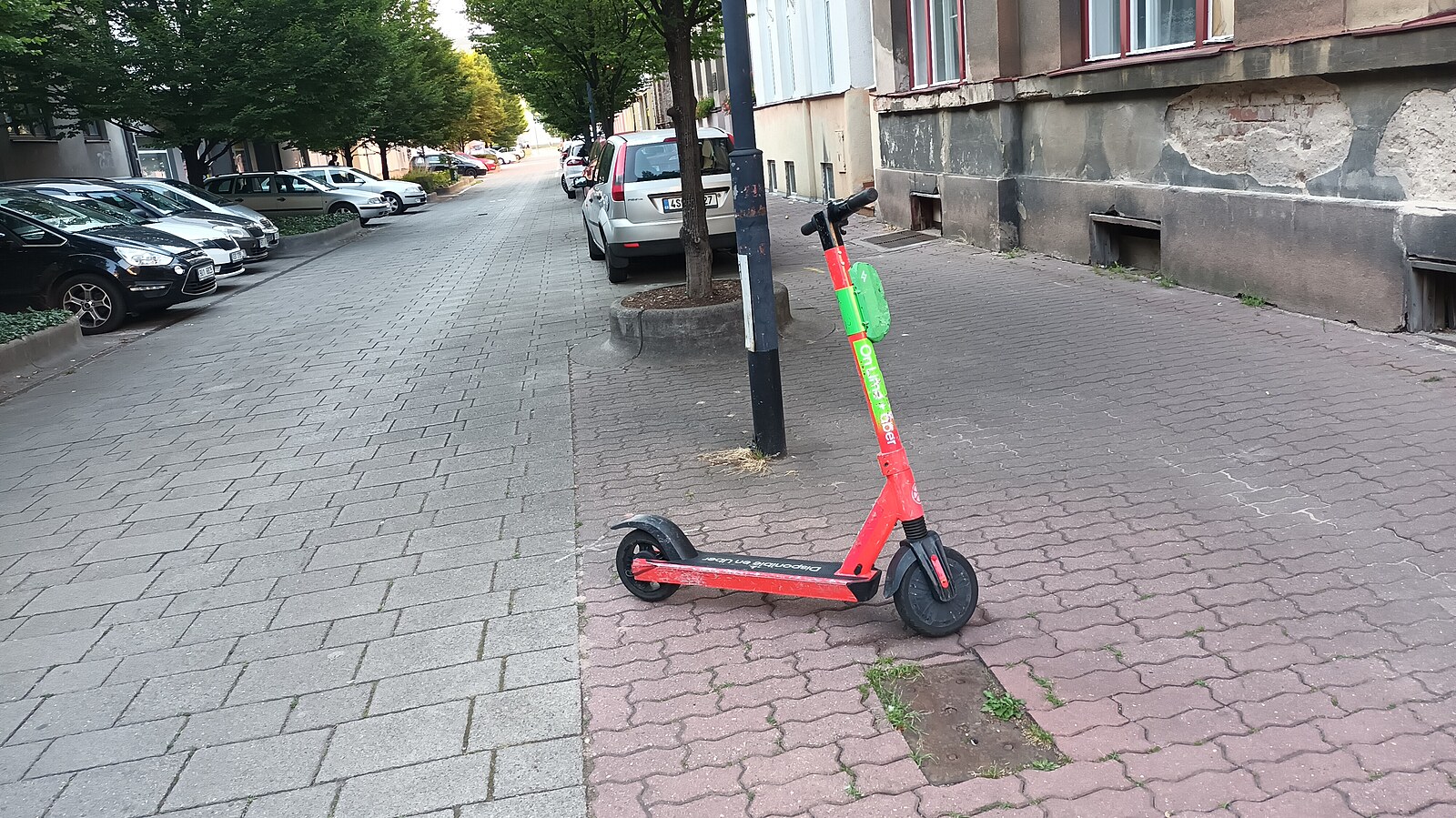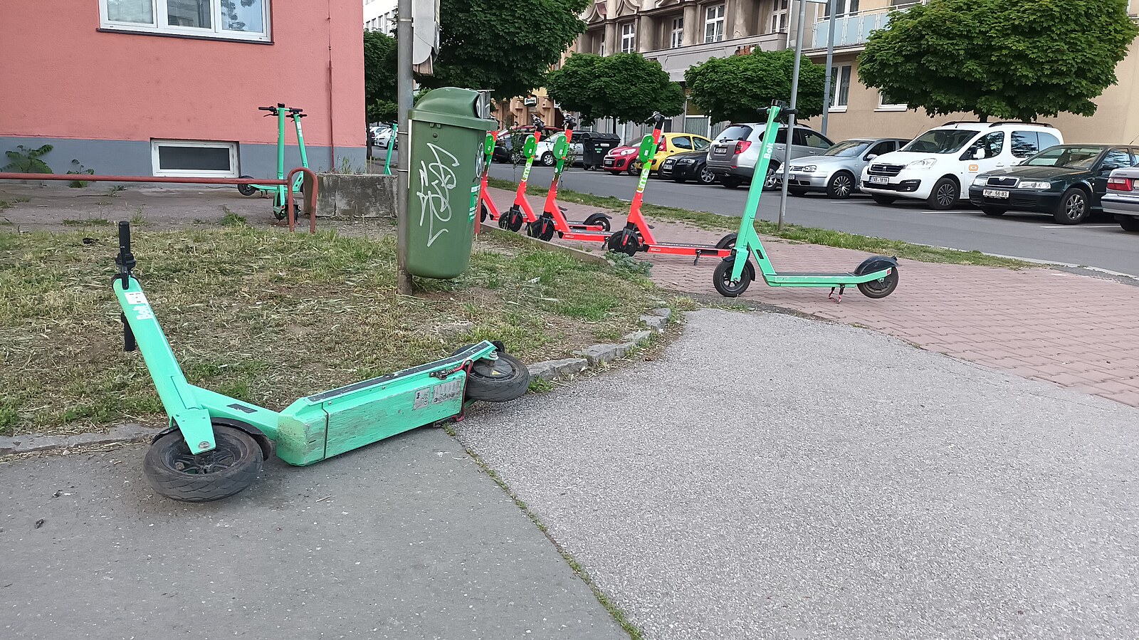 Pohozené koloběžky nebo stroje blokující stojany na kola je možné v Pardubicích na Karlovině vidět téměř každý den.