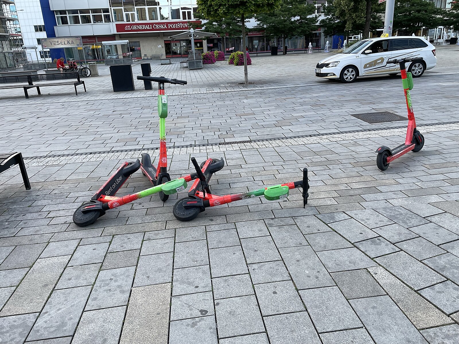 Sdílené koloběžky v Pardubicích často blokují stojany pro kola nebo stojí či leží rovnou uprostřed chodníku.