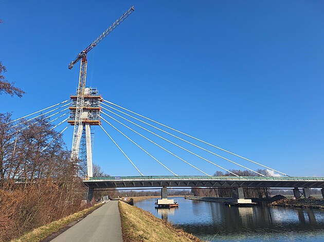 Stavba lanového mostu přes řeku Labe v Pardubicích (25. února 2025)
