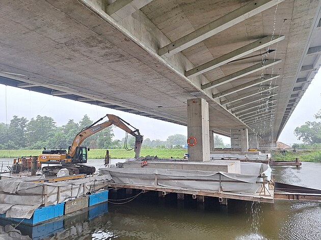 Bourání dočasných podpěr lanového mostu z pontonu plovoucího na Labi v Pardubicích (16. června 2025)