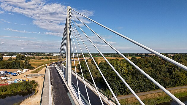 Stavba severovýchodního obchvatu Pardubic se zavěšeným lanovým mostem přes Labe se blíží do finále. (9. září 2025)