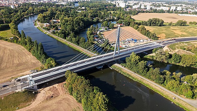 Stavba severovýchodního obchvatu Pardubic se zavěšeným lanovým mostem přes Labe se blíží do finále. (9. září 2025)