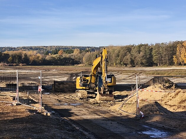 Odbahněný rybník Rosnička čeká na na vodu. Přítok je již půl roku suchý. (31. října 2025)