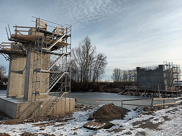 Příprava na výsun lanového mostu přes Labe v rámci severovýchodního obchvatu v Pardubicích.